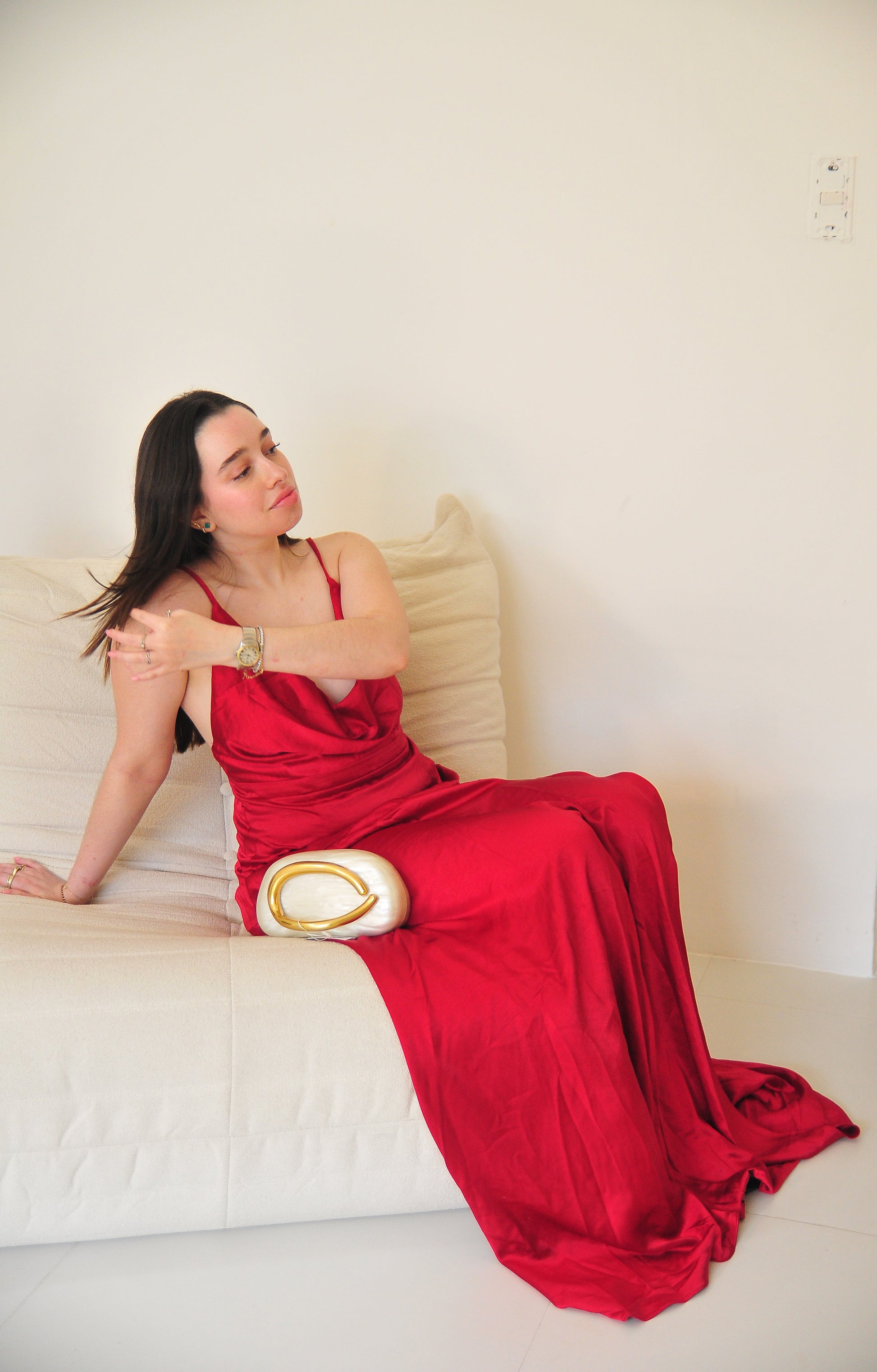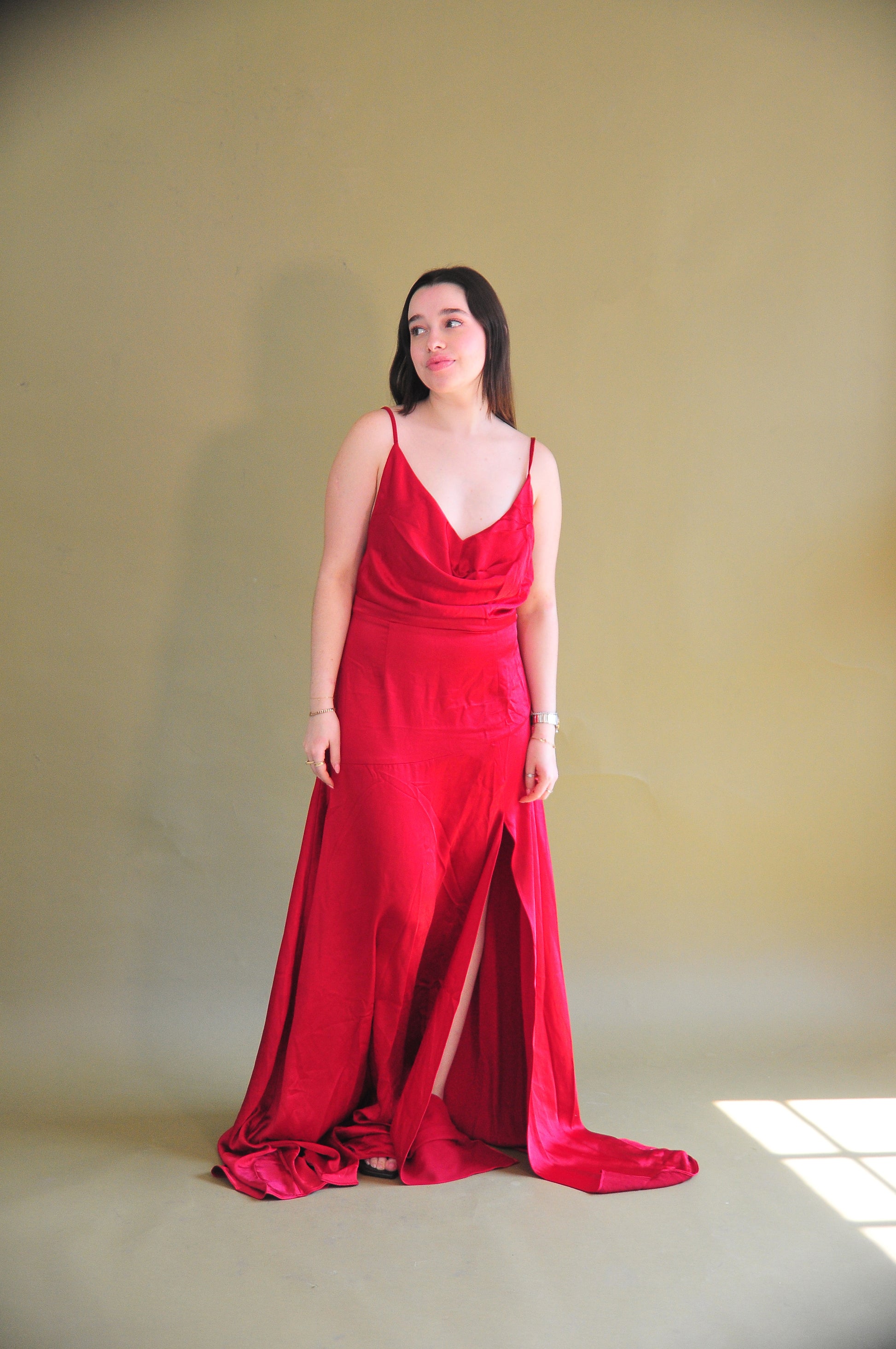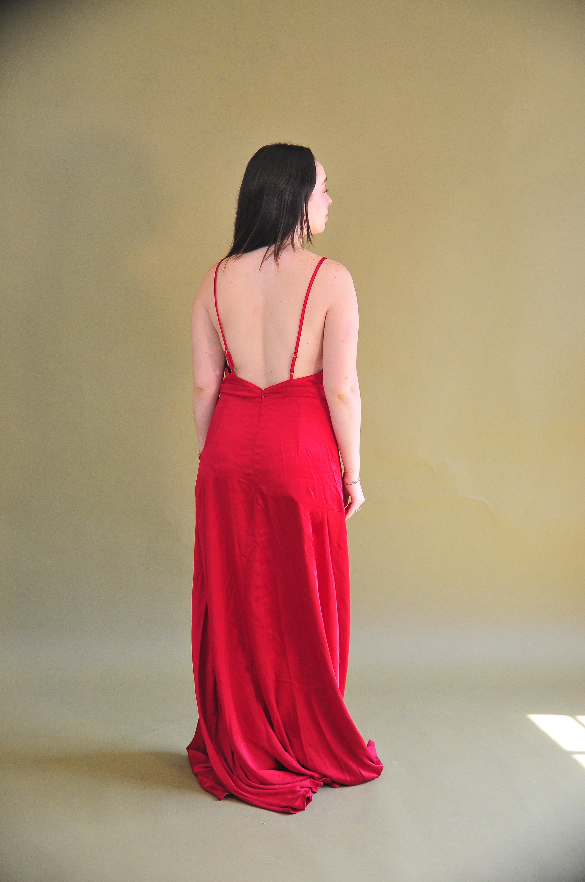 El Selena Satin Dress es un maxi gown de satén diseñado para deslumbrar en cada ocasión especial. Combina un delicado escote drapeado con finos tirantes ajustables, logrando un balance perfecto entre sutileza y sensualidad. La abertura lateral añade un toque atrevido, mientras que el forro completo asegura un acabado impecable. Su silueta fluida y sin elasticidad lo convierte en una prenda sofisticada y atemporal.