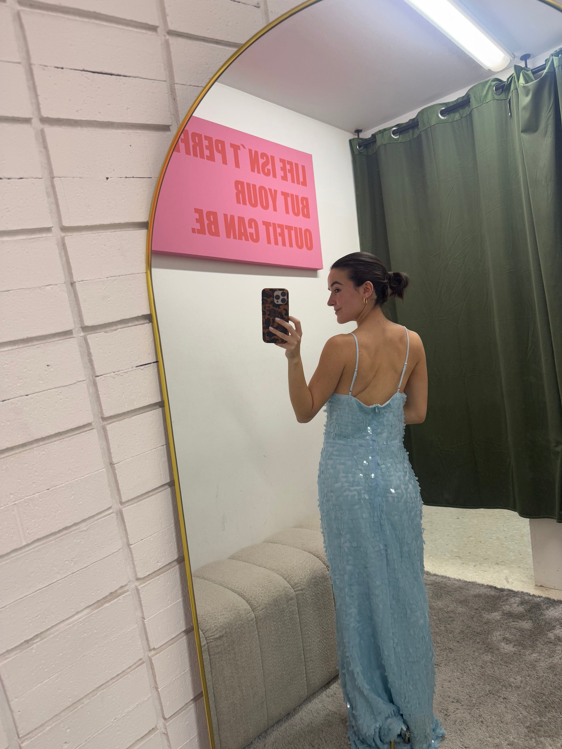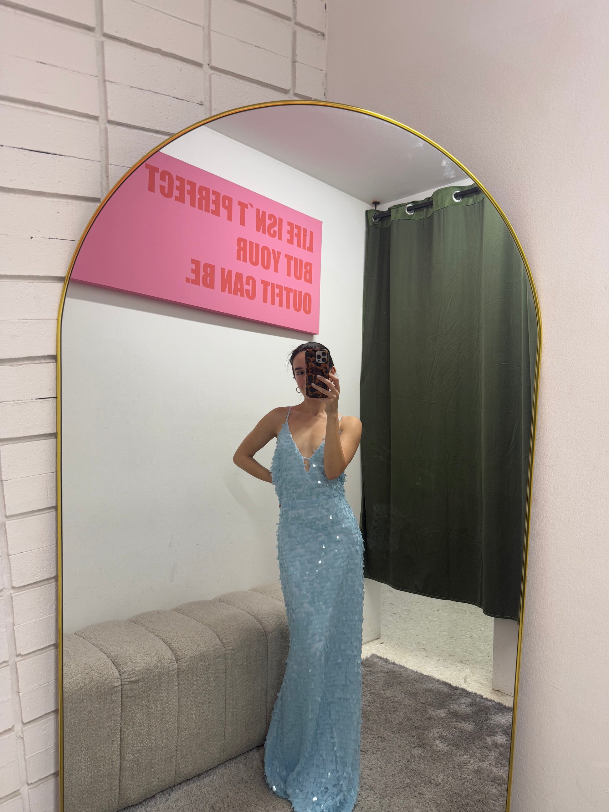 El vestido perfecto para brillar en cualquier ocasión especial. Este espectacular gown cubierto de lentejuelas crea un efecto luminoso y elegante que roba miradas.